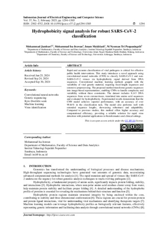 Jamhuri, Mohammad, Irawan, Mohammad Isa, Mukhlash, Imam and Puspaningsih, Ni Nyoman Tri (2025) Hydrophobicity signal analysis for robust SARS-CoV-2 classification. Indonesian Journal of Electrical Engineering and Computer Science, 37 (2). pp. 1294-1305. ISSN 2502-4760