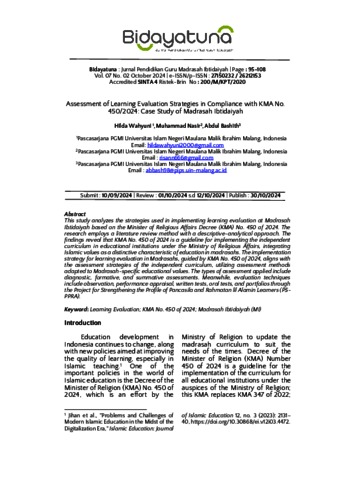 This study analyzes the strategies used in implementing learning evaluation at MadrasahI btidaiyah based on the Minister of Religious Affairs Decree (KMA) No. 450 of 2024. The research employs a literature review method with a descriptive-analytical approach. The findings reveal that KMA No. 450 of 2024 is a guideline for implementing the independent curriculum in educational institutions under the Ministry of Religious Affairs, integrating Islamic values as a distinctive characteristic of education in madrasah. The implementation strategy for learning evaluation in Madrasahs, guided by KMA No. 450 of 2024, aligns with the assessment strategies of the independent curriculum, utilizing assessment methods adapted to Madrasah-specific educational values. The types of assessment applied include diagnostic, formative, and summative assessments. Meanwhile, evaluation techniques include observation, performance appraisal, written tests, oral tests, and portfolios through the Project for Strengthening the Profile of Pancasila and Rahmatan lil Alamin Learners (P5-PPRA).