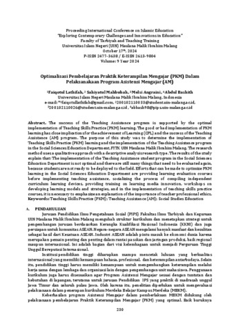 The success of the Teaching Assistance program is supported by the optimal implementation of Teaching Skills Practice (PKM) learning. The good or bad implementation of PKM learning has close implications for the achievement of Learning (CPL) and the success of the Teaching Assistance (AM) program. The purpose of this study was to determine the implementation of Teaching Skills Practice (PKM) learning and the implementation of the Teaching Assistance program in the Social Sciences Education Department, FITK UIN Maulana Malik Ibrahim Malang. The research method uses a qualitative approach with a descriptive analysis research type. The results of the study explain that: The implementation of the Teaching Assistance student program in the Social Sciences Education Department is not optimal and there are still many things that need to be evaluated again, because students are not ready to be deployed to the field. Efforts that can be made to optimize PKM learning in the Social Sciences Education Department are providing learning evaluation courses before implementing teaching assistance, socializing the process of compiling independent curriculum learning devices, providing training on learning media innovation, workshops on developing learning models and strategies, and in the implementation of teaching skills practice courses, it is necessary to emphasize an explanation of the importance of teacher professional ethics.