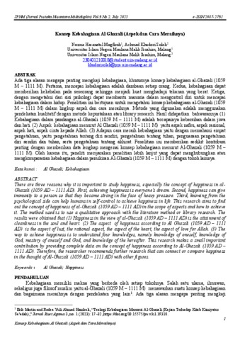 Ada tiga alasan mengapa penting mengkaji kebahagiaan, khususnya konsep kebahagiaan al-Ghazali (1059 M – 1111 M). Pertama, mencapai kebahagiaan adalah dambaan setiap orang. Kedua, kebahagiaan dapat memberikan kekebalan pada seseorang sehingga menjadi kuat menghadapi tekanan yang berat. Ketiga, dengan mengetahui dari sisi psikologi dapat membantu manusia dalam mengontrol diri untuk mencapai kebahagiaan dalam hidup. Penelitian ini bertujuan untuk mengetahui konsep kebahagiaan al-Ghazali (1059 M – 1111 M) dalam lingkup aspek dan cara meraihnya. Metode yang digunakan adalah menggunakan pendekatan kualitatif dengan metode kepustakaan atau library research. Hasil didapatkan bahwasannya (1) Kebahagiaan dalam pandangan al-Ghazali (1059 M – 1111 M) adalah tercapainya kebersihan dalam jiwa dan hati. (2) Aspek kebahagiaan menurut Al Ghazali (1059 M – 1111 M) yaitu aspek nafsu, aspek rasional, aspek hati, aspek cinta kepada Allah. (3) Adapun cara meraih kebahagiaan yaitu dengan memahami empat pengetahuan, yaitu pengetahuan tentang diri sendiri, pengetahuan tentang tuhan, penguasaan pengetahuan diri sendiri dan tuhan, serta pengetahuan tentang akhirat. Penelitian ini memberikan sedikit kontribusi penting dengan memberikan data lengkap mengenai konsep kebahagiaan menurut Al-Ghazali (1059 M – 1111 M). Oleh karena itu, peneliti menyarakan penelitian lebih lanjut yang dapat menghubungkan atau mengkomparasian kebahagiaan dalam pemikiran Al-Ghazali (1059 M – 1111 M) dengan tokoh lainnya.