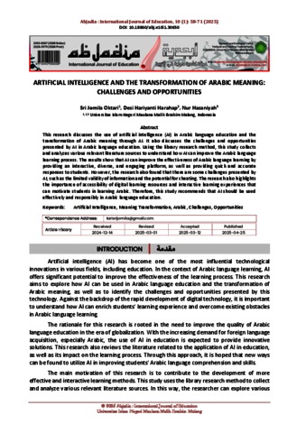 This research discusses the use of artificial intelligence (AI) in Arabic language education and the transformation of Arabic meaning through AI. It also discusses the challenges and opportunities presented by AI in Arabic language education. Using the library research method, this study collects and analyzes various relevant literature sources to understand how AI can improve the Arabic language learning process. The results show that AI can improve the effectiveness of Arabic language learning by providing an interactive, diverse, and engaging platform, as well as providing quick and accurate responses to students. However, the research also found that there are some challenges presented by AI, such as the limited validity of information and the potential for cheating. The research also highlights the importance of accessibility of digital learning resources and interactive learning experiences that can motivate students in learning Arabic. Therefore, this study recommends that AI should be used effectively and responsibly in Arabic language education.