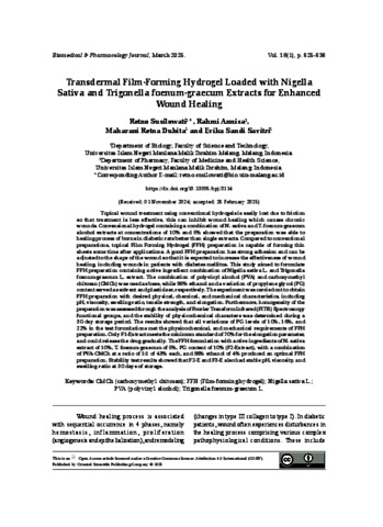 Topical wound treatment using conventional hydrogels is easily lost due to friction so that treatment is less effective, this can inhibit wound healing which causes chronic wounds. Convensional hydrogel containing a combination of N. sativa and T. foenum-graecum alcohol extracts at concentrations of 10% and 5% showed that the preparation was able to healing process of burns in diabetic rats better than single extracts. Compared to conventional preparations, topical Film Forming Hydrogel (FFH) preparation is capable of forming thin sheets some time after applications. A good FFH preparation has strong adhesion and can be adjusted to the shape of the wound so that it is expected to increase the effectiveness of wound healing, including wounds in patients with diabetes mellitus. This study aimed to formulate FFH preparation containing active ingredient combination of Nigella sativa L. and Trigonella foenum-graecum L. extract. The combination of polyvinyl alcohol (PVA) and carboxymethyl chitosan (CMCh) was used as base, while 96% ethanol and a variation of propylene glycol (PG) content served as solvent and plasticizer, respectively. The experiment was carried out to obtain FFH preparation with desired physical, chemical, and mechanical characteristics, including pH, viscosity, swelling ratio, tensile strength, and elongation. Furthermore, homogeneity of the preparation was assessed through the analysis of Fourier Transform Infrared (FITR) Spectroscopy functional groups, and the stability of physicochemical characters was determined during a 30-day storage period. The results showed that all variations of PG levels of 10%, 16%, and 22% in the test formulations met the physicochemical, and mechanical requirements of FFH preparation. Only F1-Extract meets the minimum standard of 70% for the elongation parameter, and could release the drug gradually. The FFH formulation with active ingredients of N. sativa extract of 10%, T. foenum-graecum of 5%, PG content of 10% (F2-Extract), with a combination of PVA-CMCh at a ratio of 1:1 of 43% each, and 96% ethanol of 4% produced an optimal FFH preparation. Stability test results showed that F2-E and F3-E also had stable pH, viscosity, and swelling ratio at 30 days of storage.