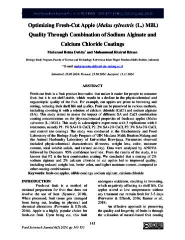 Fresh-cut fruit is a fruit product innovation that makes it easier for people to consume fruit, but it is not shelf-stable, which results in a decline in the physicochemical and organoleptic quality of the fruit. For example, cut apples are prone to browning and rotting, reducing their shelf life and quality. Fruit can be preserved in a variety of methods, one of which is by covering it with a solution of calcium chloride (CaCl) and sodium alginate (SA). This study aimed to assess the impact of different SA and CaCl combination coating concentrations on the physicochemical properties of fresh-cut apples (Malus sylvestris (L.) Mill.). This study is a descriptive experimental with 3 replications with 4 treatments, namely P1: 1% SA+1% CaCl, P2: 2% SA+2% CaCl, P3: 3% SA+3% CaCl, and control (no coating). The study was conducted at the Biochemistry and Food Laboratory of the Biology Study Program of UIN Maulana Malik Ibrahim Malang and the Animal Husbandry Laboratory of Universitas Brawijaya. Parameters observed included physicochemical characteristics (firmness, weight loss, color, moisture content, total soluble solids, titrated acidity). Data were analyzed by ANOVA followed by Duncan's test at 95% confidence level. From the results of the study, it is known that P2 is the best combination coating. We concluded that a coating of 2% sodium alginate and 2% calcium chloride on cut apples led to improved quality, including reduced weight loss, better color, and higher moisture content, compared to other coating combinations.