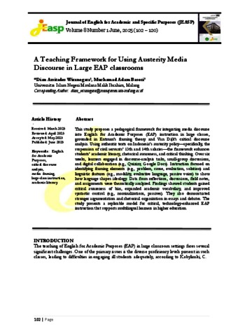 This study proposes a pedagogical framework for integrating media discourse into English for Academic Purposes (EAP) instruction in large classes, grounded in Entman’s framing theory and Van Dijk’s critical discourse analysis. Using authentic texts on Indonesia’s austerity policy—specifically, the suspension of civil servants’ 13th and 14th salaries—the framework enhances students’ academic literacy, rhetorical awareness, and critical thinking. Over six weeks, learners engaged in discourse-analysis tasks, small-group discussions, and digital collaboration (e.g., Quizizz, Google Docs). Instruction focused on identifying framing elements (e.g., problem, cause, evaluation, solution) and linguistic features (e.g., modality, evaluative language, passive voice) to show how language shapes ideology. Data from reflections, discussions, field notes, and assignments were thematically analyzed. Findings showed students gained critical awareness of bias, expanded academic vocabulary, and improved syntactic control (e.g., nominalizations, passives). They also demonstrated stronger argumentation and rhetorical organization in essays and debates. The study presents a replicable model for critical, technology-enhanced EAP instruction that supports multilingual learners in higher education.