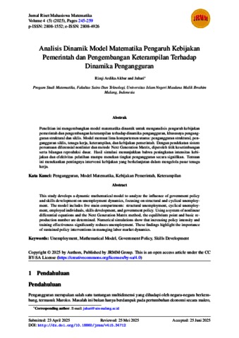 Akbar, Rizqi Ardika and Juhari, Juhari (2025) Analisis dinamik model matematika pengaruh kebijakan pemerintah dan pengembangan keterampilan terhadap dinamika pengangguran. Jurnal Riset Mahasiswa Matematika, 4 (5). pp. 245-259. ISSN 2808-4926