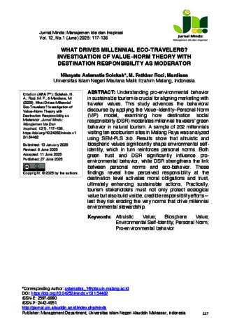 Understanding pro-environmental behavior in sustainable tourism is crucial for aligning marketing with traveler values. This study advances the behavioral discourse by applying the Value–Identity–Personal Norm (VIP) model, examining how destination social responsibility (DSR) moderates millennial travelers’ green behavior in natural tourism. A sample of 202 millennials visiting ten ecotourism sites in Malang Raya was analyzed using SEM-PLS 3.0. Results show that altruistic and biospheric values significantly shape environmental self-identity, which in turn reinforces personal norms. Both green trust and DSR significantly influence pro-environmental behavior, while DSR strengthens the link between personal norms and eco-behavior. These findings reveal how perceived responsibility at the destination level activates moral obligations and trust, ultimately enhancing sustainable actions. Practically, tourism stakeholders must not only protect ecological value but also build visible, credible responsibility efforts—lest they risk eroding the very norms that drive millennial environmental stewardship.