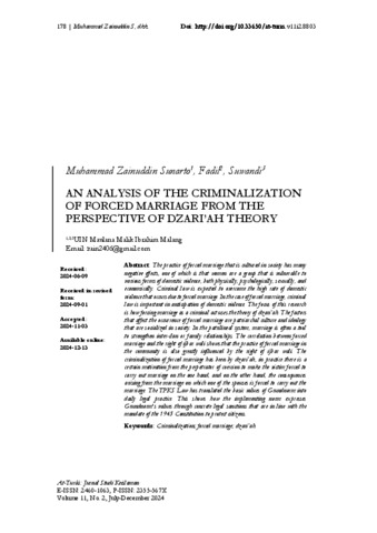 Sunarto, Muhammad Zainuddin, Fadil, Fadil and Suwandi, Suwandi (2024) An analysis of the criminalization of forced marriage from the perspective of Dzari’ah theory. At-Turāṡ: Jurnal Studi Keislaman, 11 (2). pp. 178-192. ISSN 2460-1063