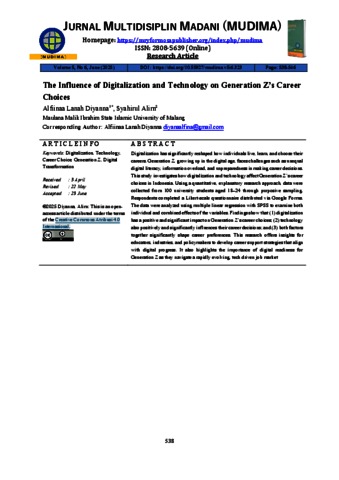 Digitalization has significantly reshaped how individuals live, learn, and choose their careers. Generation Z, growing up in the digital age, faces challenges such as unequal digital literacy, information overload, and unpreparedness in making career decisions. This study investigates how digitalization and technology affect Generation Z’s career choices in Indonesia. Using a quantitative, explanatory research approach, data were collected from 100 university students aged 18–24 through purposive sampling. Respondents completed a Likert-scale questionnaire distributed via Google Forms. The data were analyzed using multiple linear regression with SPSS to examine both individual and combined effects of the variables. Findings show that (1) digitalization has a positive and significant impact on Generation Z’s career choices; (2) technology also positively and significantly influences their career decisions; and (3) both factors together significantly shape career preferences. This research offers insights for educators, industries, and policymakers to develop career support strategies that align with digital progress. It also highlights the importance of digital readiness for Generation Z as they navigate a rapidly evolving, tech driven job market