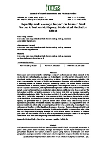 Firm value is a critical indicator for evaluating a company's performance and future prospects in the market. Factors such as liquidity, leverage, and dividend policy can influence firm value, particularly in the Islamic banking sector, which is characterized by distinct financial management principles. This study aims to examine the impact of liquidity and leverage on firm value, with profitability serving as a mediating variable and dividend policy as a moderating variable. The analysis focuses on Islamic Commercial Banks in Indonesia, Pakistan, and Bangladesh over the period 2019–2023. A quantitative research approach is employed, utilizing Moderated Regression Analysis (MRA) and Path Analysis. The sample comprises financial statement data from Islamic Commercial Banks in the three countries. The independent variables are liquidity, measured by the Current Ratio (CR), and leverage, measured by the Debt to Equity Ratio (DER). The dependent variable is firm value, proxied by the Price to Book Value (PBV). Profitability, measured by Return on Assets (ROA), functions as the mediating variable, while the Dividend Payout Ratio (DPR) represents the moderating variable. he findings reveal that both liquidity and profitability have a significant positive effect on firm value, while leverage exerts a significant negative effect. Profitability mediates the relationship between leverage and firm value but does not mediate the relationship between liquidity and firm value. Additionally, dividend policy does not moderate the effect of either liquidity or leverage on firm value. These results suggest that Islamic bank management should prioritize enhancing liquidity and profitability to improve firm value, while also exercising caution in managing leverage due to its adverse impact. Furthermore, as dividend policy does not function effectively as a moderating mechanism, strategies aimed at increasing firm value should focus more on strengthening fundamental financial performance.