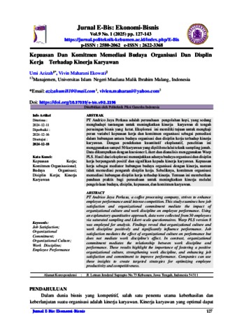 PT Andrico Jaya Perkasa adalah perusahaan pengolahan kopi, yang sedang menghadapi tantangan untuk meningkatkan kinerja karyawan di tengah persaingan bisnis yang ketat. Eksplorasi ini memiliki tujuan untuk mengkaji peran variabel kepuasan kerja dan komitmen organisasi sebagai pemediasi dalam hubungan antara budaya organisasi dan disiplin kerja terhadap kinerja karyawan. Dengan pendekatan kuantitatif eksplanatif, penelitian ini menggunakan sampel 50 karyawan yang dipilih melalui teknik sampling jenuh. Data dikumpulkan dengan kuesioner Likert dan dianalisis menggunakan Warp PLS. Hasil dari eksplorasi menunjukkan adanya budaya organisasi dan disiplin kerja berpengaruh positif dan signifikan kepada kinerja karyawan. Kepuasan kerja sebagai mediator hubungan budaya organisasi dengan kinerja, namun tidak memediasi pengaruh disiplin kerja. Sebaliknya, komitmen organisasi memediasi hubungan disiplin kerja terhadap kinerja. Temuan ini memberikan panduan praktis bagi perusahaan untuk meningkatkan kinerja melalui pengelolaan budaya, disiplin, kepuasan, dan komitmen karyawan.