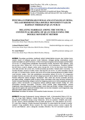 Penundaan pernikahan (waithood) akibat ketidakstabilan ekonomi dan tuntutan karier semakin marak di kalangan generasi muda Indonesia, sehingga penting menelaahnya secara kontekstual dalam perspektif keislaman. Artikel ini bertujuan mengkaji makna kesiapan menikah dalam QS An‑Nur: 32 menggunakan pendekatan Hermeneutika Double Movement Fazlur Rahman, untuk merumuskan sintesis antara teks Al‑Qur’an dan dinamika sosial kontemporer. Penelitian kualitatif bersifat library research, dengan sumber primer berupa teks Al‑Qur’an dan karya Fazlur Rahman, serta data sekunder dari jurnal, buku, terkait penundaan pernikahan. Metode analisis mencakup: (1) Gerakan Pertama: menelusuri konteks historis dan linguistik QS An‑Nur: 32 untuk memahami maksud asli ayat; (2) Gerakan Kedua: menarik nilai moral universal dan menerjemahkannya ke dalam konteks sosial ekonomi modern. Hasil dan pembahasan menunjukkan bahwa QS An‑Nur: 32 menegaskan kesiapan finansial, emosional, dan spiritual sebagai prasyarat sakral sebelum menikah. Pada Gerakan Pertama ditemukan bahwa larangan “berkhalwat” atau istilah lain berzina menandai perlunya persiapan matang, sedangkan pada Gerakan Kedua, penundaan nikah yang bertujuan memperkuat fondasi keluarga dipandang sebagai manifestasi tanggung jawab moral, bukan pengabaian perintah agama. Sintesis hermeneutik ini menegaskan bahwa waithood dapat menjadi strategi etis untuk mewujudkan keluarga berkualitas. Kontribusi artikel terletak pada pengembangan wacana keagamaan yang menegaskan kesiapan sebagai syarat utama pernikahan, sekaligus menjadi acuan bagi pemuka agama dan pembuat kebijakan dalam merumuskan kebijakan sosial‑keagamaan yang lebih berorientasi pada kualitas keluarga.