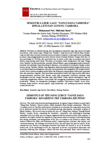 Penelitian ini dilatarbelakangi oleh meningkatnya popularitas lagu-lagu daerah di tengah masyarakat, salah satunya lagu “Nangi Dana Tambora” yang berasal dari wilayah Bima-Dompu. Lagu ini tidak hanya menarik perhatian karena melodinya yang khas, tetapi juga karena kandungan pesannya yang menggambarkan peristiwa dahsyat letusan Gunung Tambora. Dengan lebih dari 2,6 juta penayangan di YouTube dan penyebaran luas di media sosial, lagu ini menjadi representasi budaya yang penting untuk dikaji. Penelitian ini bertujuan untuk menganalisis lirik lagu “Nangi Dana Tambora” melalui pendekatan semiotika Roland Barthes, guna mengungkap makna denotatif, konotatif, dan mitologis yang terkandung di dalamnya, serta menilai kesesuaiannya dengan realitas historis letusan Tambora. Metode yang digunakan adalah deskriptif kualitatif dengan teknik analisis isi, melalui tahapan mendengarkan, mencatat, menerjemahkan, dan mengaitkan lirik dengan konteks sejarah. Proses analisis mengikuti model Miles dan Huberman yang meliputi reduksi data, penyajian data, dan penarikan simpulan. Hasil penelitian menunjukkan bahwa lirik lagu tersebut tidak hanya merepresentasikan peristiwa fisik letusan, tetapi juga membentuk konstruksi ideologis yang membingkai bencana sebagai kehendak alam yang mutlak. Dalam lapisan mitologisnya, lagu ini cenderung mengabaikan dimensi sosial-politik dan menggiring pemahaman yang menormalisasi penderitaan. Temuan ini menegaskan pentingnya membaca representasi budaya secara kritis, terutama dalam konteks wacana populer yang membentuk cara pandang masyarakat terhadap sejarah dan bencana.
