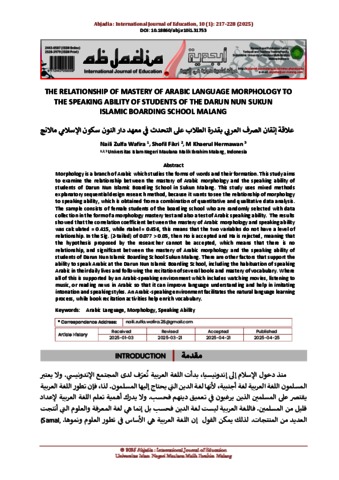 The relationship of mastery of Arabic language morphology to the speaking ability of students of the Darun Nun Sukun Islamic Boarding School Malang.