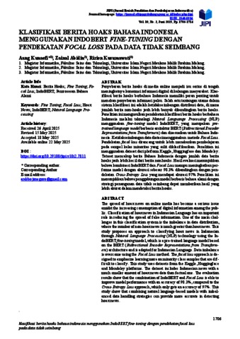 Klasifikasi berita hoaks bahasa Indonesia menggunakan indobert fine-tuning dengan pendekatan focal loss pada data tidak seimbang.