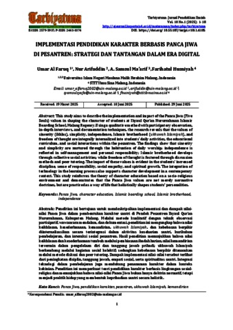 Penelitian ini bertujuan untuk mendeskripsikan implementasi dan dampak nilainilai Panca Jiwa dalam pembentukan karakter santri di Pondok Pesantren Ihyaul Qur’an Nururrahman, Kabupaten Malang. Melalui metode kualitatif dengan teknik observasi partisipatif, wawancara mendalam, dan dokumentasi, penelitian ini mengungkap bahwa nilai keikhlasan, kesederhanaan, kemandirian, ukhuwah Islamiyah, dan kebebasan berpikir diinternalisasikan secara terintegrasi dalam aktivitas keseharian santri, kurikulum pembelajaran, dan interaksi sosial pesantren. Hasil penelitian menunjukkan bahwa nilai keikhlasan dan kesederhanaan tumbuh melalui pembiasaan ibadah harian; nilai kemandirian tercermin dalam pengelolaan diri dan tanggung jawab pribadi; ukhuwah Islamiyah berkembang melalui kegiatan sosial kolektif; sedangkan kebebasan berpikir ditanamkan melalui metode diskusi dan peer tutoring. Dampak implementasi nilai-nilai tersebut terlihat dari peningkatan disiplin, tanggung jawab, empati sosial, serta spiritualitas santri. Integrasi teknologi dalam pembelajaran juga mendukung penanaman karakter dalam konteks kekinian. Penelitian ini memperkuat teori pendidikan karakter berbasis lingkungan sosialreligius dan menunjukkan bahwa nilai-nilai Panca Jiwa bukan hanya doktrin normatif, tetapi menjadi praktik hidup yang membentuk kepribadian santri secara holistik.