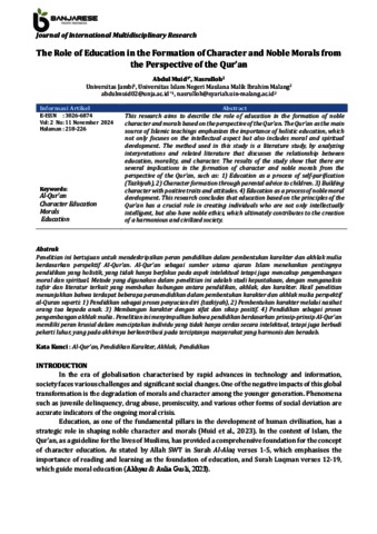 Muid, Abdul and Nasrulloh, Nasrulloh (2024) The role of education in the formation of character and noble morals from the perspective of the Qur’an. Journal of International Multidisciplinary Research, 2 (11). pp. 218-226. ISSN 3026-6874