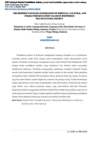 Buchori, Moh Subthi and Lailiyah, Iffatul (2025) The Prophet's Mawlid: Integration of spiritual, cultural, and character education values in Indonesian multicultural society. JIPI (Jurnal Ilmiah Pendidikan Islam), 4 (2). pp. 55-69. ISSN 29634318