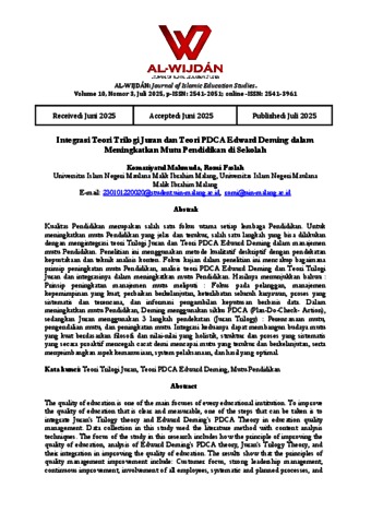 The quality of education is one of the main focuses of every educational institution. To improve the quality of education that is clear and measurable, one of the steps that can be taken is to integrate Juran's Trilogy theory and Edward Deming's PDCA Theory in education quality management. Data collection in this study used the literature method with content analysis techniques. The focus of the study in this research includes how the principle of improving the quality of education, analysis of Edward Deming's PDCA theory, Juran's Trilogy Theory, and their integration in improving the quality of education. The results show that the principles of quality management improvement include: Customer focus, strong leadership management, continuous improvement, involvement of all employees, systematic and planned processes, and the PDCA cycle (Plan-Do-Check-Action), while Juran used a three-step approach (Juran Trilogy): Quality planning, quality control, and quality improvement. The integration of both can build a strong quality culture based on holistic philosophy and values, systematic structures and processes that proactively prevent defects to achieve measurable and sustainable quality, and balance human aspects, implementation systems, and optimal results.