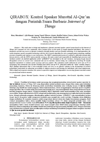 Penelitian ini bertujuan untuk merancang dan mengimplementasikan sistem kontrol speaker murottal Al-Qur’an berbasis Internet of Things (IoT) yang dioperasikan melalui perintah suara, dengan fokus utama pada kebutuhan penyandang tunanetra. Sistem ini dirancang untuk memberikan kemudahan akses terhadap bacaan Al-Qur’an melalui teknologi yang intuitif dan ramah pengguna. Dalam implementasinya, sistem menggabungkan teknologi speech recognition dengan algoritma Aho-Corasick untuk pencocokan pola perintah suara, yang memungkinkan sistem mengenali dan merespons instruksi pengguna dengan akurat. Protokol komunikasi MQTT digunakan untuk mentransmisikan data antar perangkat secara efisien, dengan mikrokontroler ESP32 sebagai unit kendali utama yang menangani proses logika dan kontrol perangkat keras. Sebagai antarmuka pengguna, dikembangkan aplikasi Android bernama “QIRABOX” yang memanfaatkan layanan Google Speech Recognition untuk mengonversi perintah suara menjadi teks secara real-time. Pengujian sistem dilakukan dengan melibatkan 10 responden tunanetra untuk mengevaluasi akurasi sistem dan tingkat kenyamanan pengguna. Hasil evaluasi menunjukkan bahwa sistem memiliki tingkat kesalahan sebesar 2% dalam mengenali perintah suara, serta memperoleh skor System Usability Scale (SUS) sebesar 78,75 yang dikategorikan dalam tingkat kegunaan “Baik”. Temuan ini menunjukkan bahwa sistem kendali berbasis suara dapat menjadi solusi efektif dalam pengembangan teknologi asistif, khususnya dalam meningkatkan aksesibilitas ibadah dan pembelajaran bagi penyandang disabilitas netra. Dengan antarmuka yang sederhana dan responsif, sistem ini diharapkan mampu mendukung kemandirian pengguna dalam mengakses murottal Al-Qur’an secara praktis dan inklusif.
