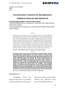 Pemahaman terhadap konsep psikologi Ibnu Miskawaih memiliki implikasi signifikan bagi perkembangan psikologi Islam di masa depan. Penelitian ini bertujuan untuk mengkaji konsep psikologi Ibnu Miskawaih melalui metode kualitatif studi pustaka. Hasil analisis menunjukkan bahwa konsep psikologi Ibnu Miskawaih didasarkan pada tiga elemen utama: penggambaran tiga kekuatan jiwa, konsep karakter (khuluq), dan pentingnya pendidikan akhlak. Tiga kekuatan jiwa meliputi daya berpikir (al-quwwah alnatiqah), daya emosi (al-quwwah al-ghadabiyyah), dan daya nafsu (al-quwwah albahimiyyah), yang berinteraksi untuk membentuk perilaku. Karakter (khuluq) dipandang sebagai hasil interaksi antara faktor bawaan dan pendidikan, yang menekankan pentingnya pembentukan individu berakhlak mulia. Ia juga meyakini bahwa pendidikan akhlak harus dimulai sejak dini dan dilakukan secara sistematis melalui latihan berulang. Kesimpulannya, pemikiran Ibnu Miskawaih menawarkan kerangka kerja holistik untuk memahami jiwa manusia dan pentingnya pembentukan karakter yang berkesinambungan.