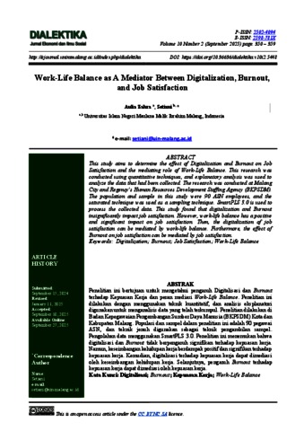 This study aims to determine the effect of Digitalization and Burnout on Job Satisfaction and the mediating role of Work-Life Balance. This research was conducted using quantitative techniques, and explanatory analysis was used to analyze the data that had been collected. The research was conducted at Malang City and Regency's Human Resources Development Staffing Agency (BKPSDM). The population and sample in this study were 90 ASN employees, and the saturated technique was used as a sampling technique. SmartPLS 3.0 is used to process the collected data. This study found that digitalization and Burnout insignificantly impact job satisfaction. However, work-life balance has a positive and significant impact on job satisfaction. Then, the digitalization of job satisfaction can be mediated by work-life balance. Furthermore, the effect of Burnout on job satisfaction can be mediated by job satisfaction.