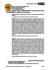 Penelitian ini mengeksplorasi implementasi metode TEACCH (Treatment and Education of Autistic and related Communication-handicapped Children) untuk meningkatkan keterampilan toilet training pada anak dengan Gangguan Spektrum Autisme ( GSA) di TKLB River Kids. Menggunakan pendekatan kualitatif dengan desain studi kasus, penelitian melibatkan tiga guru dan satu terapis melalui observasi partisipatif, wawancara mendalam, dan studi dokumentasi. Data dianalisis dengan model Miles dan Huberman meliputi reduksi data, penyajian data, dan penarikan kesimpulan, dengan validasi melalui triangulasi. Hasil menunjukkan metode TEACCH efektif membantu anak autis mengembangkan keterampilan toilet training melalui pendekatan visual terstruktur. Komponen kunci keberhasilan meliputi jadwal visual, penandaan area toilet, visualisasi langkah, lingkungan konsisten, penguatan positif, dan latihan rutin. Tantangan utama mencakup kesulitan memahami isyarat tubuh, respon lambat terhadap stimuli visual, sensitivitas sensorik, dan menjaga konsistensi sekolah-rumah. Faktor penentu keberhasilan adalah konsistensi rutinitas, alat bantu visual efektif, lingkungan nyaman, dan kolaborasi guru-orang tua. Penelitian memberikan kontribusi penting dalam pengembangan model intervensi berbasis bukti untuk toilet training anak autis sesuai konteks pendidikan khusus Indonesia.