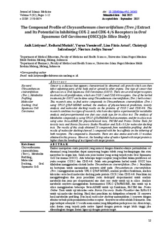 Cancer is a disease that appears characterized by abnormal cell growth which can then infect adjoining parts of the body and or spread to other organs. One type of cancer that often occurs is Oral Squamous Cell Carcinoma (OSCC). There are several target receptors involved in cell proliferation, which are COX-2 and CDK-4/6 receptors. One of the herbal treatments for OSCC can be done using Chrsanthemum cinerariifolium Trev.) herb extract. This research aims to find active compounds in hrysanthemum cinerariifolium (Trev.) using UPLC-QToF-MS/MS method, the analysis of physiochemical prediction, toxicity analysis and molecular docking results on the proteins of COX-2 and CDK-4/6. This research combines two types of research, which are descriptive experimental for metabolite analysis and preexperimental one shot case study type for in silico test. The analysis of Metabolite compounds is using UPLC-QToFMS/MS Instrumentation, and for in silico tests using some SwissADME for physiochemical tests, PkCSM and Protox Online Tools for toxicity tests and Biovia Discovery Studio Visualizer and PyRx 0.8 for molecular docking tests. The results of this study obtained 28 compounds from metabolite profiling. And the results of molecular docking showed 1 compound with the best affinity on the tethering of both receptors. The compound is Diosmetin. There are also amino acid with 15 residues obtained in this process. However, the bonding value of native ligand with target protein is higher than the bonding of test ligand with target protein.