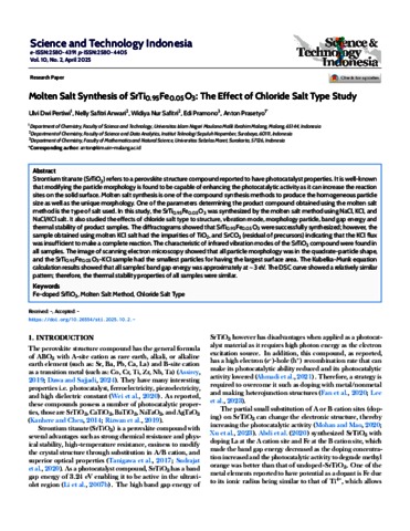 Strontium titanate (SrTiO3) refers to a perovskite structure compound reported to have photocatalyst properties. It is well-known that modifying the particle morphology is found to be capable of enhancing the photocatalytic activity as it can increase the reaction sites on the solid surface. Molten salt synthesis is one of the compound synthesis methods to produce the homogeneous particle size as well as the unique morphology. One of the parameters determining the product compound obtained using the molten salt method is the type of salt used. In this study, the SrTi0.95Fe0.05O3 was synthesized by the molten salt method using NaCl, KCl, and NaCl/KCl salt. It also studied the effects of chloride salt type to structure, vibration mode, morphology particle, band gap energy and thermal stability of product samples. The diffractograms showed that SrTi0.95Fe0.05O3 were successfully synthesized; however, the sample obtained using molten KCl salt had the impurities of TiO2, and SrCO3 (residual of precursors) indicating that the KCl flux was insufficient to make a complete reaction. The characteristic of infrared vibration modes of the SrTiO3 compound were found in all samples. The image of scanning electron microscopy showed that all particle morphology was in the quadrate-particle shape, and the SrTi0.95Fe0.05O3-KCl sample had the smallest particles for having the largest surface area. The Kubelka-Munk equation calculation results showed that all samples’ band gap energy was approximately at ∼3 eV. The DSC curve showed a relatively similar pattern; therefore, the thermal stability properties of all samples were similar