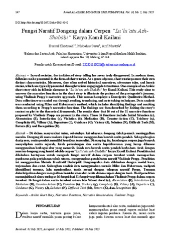 In oral societies, the tradition of story telling has never truly disappeared. In modern times, folktales can be presented in the form of short stories. As a genre of prose, short stories possess their own distinct characteristics. Moreover, they often embed historical narratives, adventure tales, and heroic stories, which are typically presented through various engaging plot structures. One example of an Arabic short story rich in folktale elements is "Lu’lu’atu ash-Shabāḥi" by Kamil Kailani. This study aims to uncover the narrative functions in the short story to illustrate the pattern of the protagonist’s journey, using Vladimir Propp’s narrative approach. This research employs a Descriptive Qualitative Method. Data collection was carried out through reading, translating, and note-taking techniques. Data analysis was conducted using Miles and Huberman’s method, which includes identifying findings and marking them according to Propp’s narrative functions. The findings are then described by linking the story’s context or plot to the theoretical framework. The results show that 16 out of the 31 narrative functions proposed by Vladimir Propp are present in the story. These 16 functions include Initial Situation (α), Absentation (β), Interdiction (γ), Violation (δ), Mediation (B), Counter-Action (C), Trickery (η), Complicity (θ), Villany (A), Departure (↑), Guidance (G), Victory (J), Solution (N), Difficult Task (M), Return (K), and Recognition (R).
