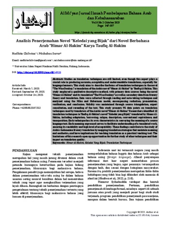 Studies on translation techniques are still limited, even though this aspect plays a crucial role in producing accurate, acceptable, and understandable translations, especially for language learners. This study aims to describe the forms of translation techniques in the novel "The Wise Donkey," a translation of the Arabic novel "Himar Al-Hakim" by Taufiq Al-Hakim. This study employed a qualitative descriptive method, with primary data sources being the novel "Himar Al-Hakim" and its translation "The Wise Donkey," as well as secondary data from literary theory and translation. Data were collected through reading and note-taking techniques and analyzed using the Miles and Huberman model, encompassing reduction, presentation, verification, and conclusion. Validity was maintained through source triangulation, expert consultation, and rereading of the text. This study presents 95 data points on translation techniques used by translators of the Arabic novel "Himar Al-Hakim." Researchers identified 12 translation techniques in Taufiq Al-Hakim's novel "Keledai yang Bijak," translated by Himar Al-Hakim, including adaptation, borrowing, calque, description, conventional equivalence, and transposition. Each technique has its own characteristics in conveying the meaning of a source language text. Each meaning expressed serves to facilitate understanding of a translated work, ensuring its readability and high level of acceptability. These findings contribute to the study of Arabic-Indonesian literary translation by mapping translation strategies that maintain meaning and aesthetics, and have implications for teaching translation as a practical teaching tool. The limitations of this research open up opportunities for further study of other techniques and their impact on translation quality.