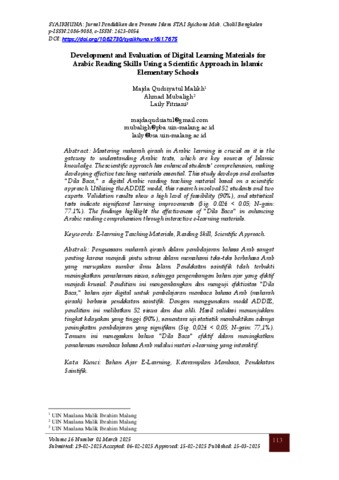 Malikh, Majda Qudsiyatul, Mubaligh, Ahmad and Fitriani, Laily (2025) Development and evaluation of digital learning materials for Arabic reading skills using a scientific approach in Islamic Elementary Schools. Syaikhuna: Jurnal Pendidikan dan Pranata Islam STAI Syaichona Moh. Cholil Bangkalan, 16 (1). pp. 113-128. ISSN 2623-0054