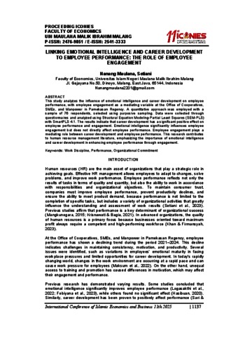 This study analyzes the influence of emotional intelligence and career development on employee performance, with employee engagement as a mediating variable at the Office of Cooperatives, SMEs, and Manpower in Pamekasan Regency. A quantitative approach was employed with a sample of 76 respondents, selected using purposive sampling. Data were collected through questionnaires and analyzed using Structural Equation Modeling-Partial Least Squares (SEM-PLS) with SmartPLS 4.1. The results indicate that career development has a significant positive effect on employee performance and engagement. Emotional intelligence significantly influences employee engagement but does not directly affect employee performance. Employee engagement plays a mediating role between career development and employee performance. This research contributes to human resource management literature, emphasizing the importance of emotional intelligence and career development in enhancing employee performance through engagement