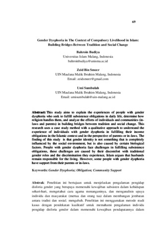 This study aims to explain the experiences of people with gender dysphoria who seek to fulfill subsistence obligations in daily life, determine how religion handles them, and analyze the efforts of individuals and communities (in-laws and parents) in building bridges between tradition and social change. This research uses a case study method with a qualitative approach to understand the experience of individuals with gender dysphoria in fulfilling their income obligations in the Islamic context and in the perspective of parents or in-laws. The finding of this study is that gender identity is not something that is completely influenced by the social environment, but is also caused by certain biological factors. People with gender dysphoria face challenges in fulfilling subsistence obligations, these challenges are caused by their discomfort with traditionalgender roles and the discrimination they experience, Islam argues that husbands remain responsible for the living. However, some people with gender dysphoria have support from their parents or in-laws.