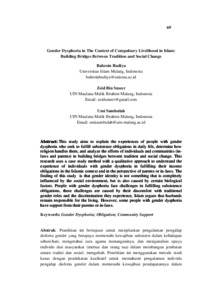 Budiya, Bahroin, Smeer, Zeid Bin and Sumbulah, Umi (2024) Gender dysphoria in the context of compulsory livelihood in Islam: Building bridges between tradition and social change. Dialogia: Jurnal Studi Islam dan Sosial, 22 (1). pp. 69-85. ISSN 16931149; eISSN 25023853