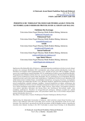 Persepsi guru terhadap transisi dari pembelajaran tematik ke pembelajaran berbasis proyek di SDI Al Ghaffaar Malang.