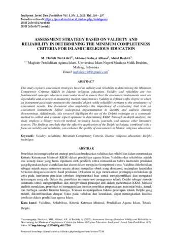 This study explores assessment strategies based on validity and reliability in determining the Minimum Competency Criteria (Kriteria Ketuntasan Minimal or KKM) in Islamic religious education. Validity and reliability are two fundamental concepts educators must understand to ensure that the assessment instruments used are dependable and accurate in measuring student competencies. Validity is defined as the degree to which an instrument accurately measures the intended object, while reliability pertains to the consistency of assessment results. The document also emphasizes the importance of conducting trial tests on assessment instruments before widespread implementation to identify and address existing shortcomings. Additionally, this research highlights the use of the Delphi technique as a systematic method to collect and evaluate expert opinions in determining KKM. Through in-depth analysis, the study employs a library research method, reviewing books, journals, and various other literature sources. The findings conclude that the effective application of the Delphi technique, combined with a focus on validity and reliability, can enhance the quality of assessments in Islamic religious education.
