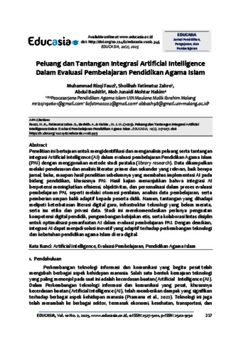 Penelitian ini bertujuan untuk mengidentifikasi dan menganalisis peluang serta tantangan integrasi Artificial Intelligence (AI) dalam evaluasi pembelajaran Pendidikan Agama Islam (PAI) dengan menggunakan metode studi pustaka (library research). Data dikumpulkan melalui penelusuran dan analisis literatur primer dan sekunder yang relevan, baik berupa jurnal, buku, maupun hasil penelitian sebelumnya yang membahas implementasi AI pada bidang pendidikan, khususnya PAI. Hasil kajian menunjukkan bahwa integrasi AI berpotensi meningkatkan efisiensi, objektivitas, dan personalisasi dalam proses evaluasi pembelajaran PAI, seperti melalui otomasi penilaian, analisis data pembelajaran, serta pemberian umpan balik adaptif kepada peserta didik. Namun, tantangan yang dihadapi meliputi keterbatasan literasi digital guru, infrastruktur teknologi yang belum merata, serta isu etika dan privasi data. Studi ini merekomendasikan perlunya penguatan kompetensi digital pendidik, pengembangan kebijakan etis, serta kolaborasi lintas disiplin untuk optimalisasi pemanfaatan AI dalam evaluasi pembelajaran PAI. Dengan demikian, integrasi AI dapat menjadi solusi inovatif yang adaptif terhadap perkembangan teknologi dan kebutuhan pendidikan agama Islam di era digital.