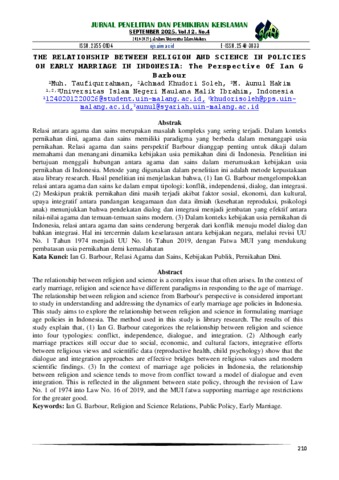 The relationship between religion and science in policies on early marriage in Indonesia: The perspective of Ian G Barbour.