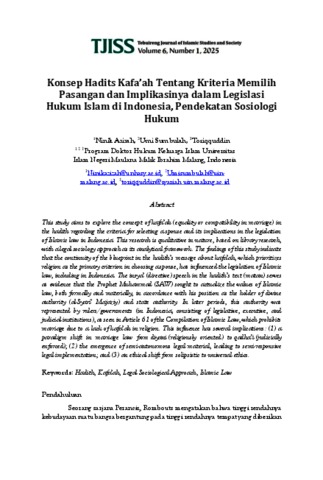 Azizah, Ninik, Sumbulah, Umi and Toriqquddin, Toriqquddin (2025) Konsep hadits kafa'ah tentang kriteria memilih pasangan dan implikasinya dalam legislasi hukum Islam di Indonesia, pendekatan sosiologi hukum. Tebuireng: Journal of Islamic Studies and Society, 6 (1). pp. 98-118. ISSN 27468127; eISSN 27752151