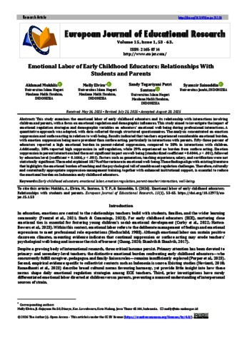 This study examines the emotional labor of early childhood educators and its relationship with interactions involving children and parents, with a focus on emotional regulation and demographic influences. This study aimed to investigate the impact of emotional regulation strategies and demographic variables on educators’ emotional well-being during professional interactions. A quantitative approach was adopted, with data collected through structured questionnaires. The analysis concentrated on emotion suppression and surface acting in relation to well-being. Results indicated that teachers experienced considerable emotional burden, with emotion suppression being more prevalent than surface acting, particularly in interactions with parents. Fifty-three percent of educators reported a high emotional burden in parent-related suppression, compared to 38% in interactions with children. Additionally, 38% reported high suppression in self-regulation, while 29% experienced no burden from surface acting. Emotion suppression in parent interactions had the most significant impact on well-being (standardized coefficient = 0.4044, p < .001), followed by education level (coefficient = 0.1646, p < .001). Factors such as generation, teaching experience, salary, and certification were not statistically significant. The model explained 18.7% of the variance in emotional well-being. These findings align with existing literature that highlights the emotional burden of teaching and the psychological toll of unaddressed regulation challenges. Therefore, culturally and contextually appropriate suppression-management training, together with enhanced institutional support, is essential to reduce the emotional burden on Indonesian early childhood educators.