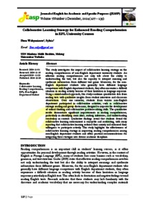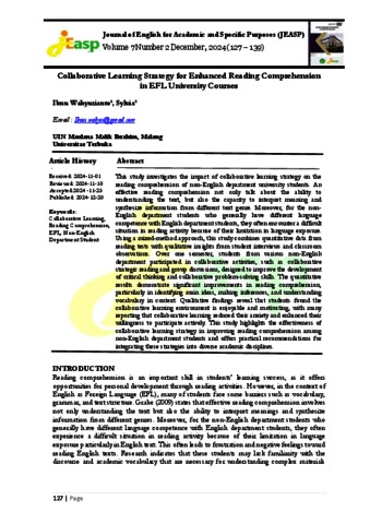 This study investigates the impact of collaborative learning strategy on the reading comprehension of non-English department university students. An effective reading comprehension not only talk about the ability to understanding the text, but also the capacity to interpret meaning and synthesize information from different text genre. Moreover, for the non English department students who generally have different language competence with English department students, they often encounter a difficult situation in reading activity because of their limitation in language exposure. Using a mixed-method approach, this study combines quantitative data from reading tests with qualitative insights from student interviews and classroom observations. Over one semester, students from various non-English department participated in collaborative activities, such as collaborative strategic reading and group discussions, designed to improve the development of critical thinking and collaborative problem-solving skills. The quantitative results demonstrate significant improvements in reading comprehension, particularly in identifying main ideas, making inferences, and understanding vocabulary in context. Qualitative findings reveal that students found the collaborative learning environment is enjoyable and motivating, with many reporting that collaborative learning reduced their anxiety and enhanced their willingness to participate actively. This study highlights the effectiveness of collaborative learning strategy in improving reading comprehension among non-English department students and offers practical recommendations for integrating these strategies into diverse academic disciplines.