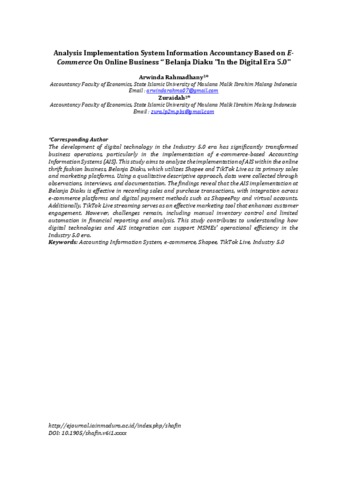 The development of digital technology in the Industry 5.0 era has significantly transformed business operations, particularly in the implementation of e-commerce-based Accounting Information Systems (AIS). This study aims to analyze the implementation of AIS within the online thrift fashion business, Belanja Diaku, which utilizes Shopee and TikTok Live as its primary sales and marketing platforms. Using a qualitative descriptive approach, data were collected through observations, interviews, and documentation. The findings reveal that the AIS implementation at Belanja Diaku is effective in recording sales and purchase transactions, with integration across e-commerce platforms and digital payment methods such as ShopeePay and virtual accounts. Additionally, TikTok Live streaming serves as an effective marketing tool that enhances customer engagement. However, challenges remain, including manual inventory control and limited automation in financial reporting and analysis. This study contributes to understanding how digital technologies and AIS integration can support MSMEs’ operational efficiency in the Industry 5.0 era.