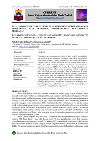 This study looks at how sales growth, profitability, and leverage affect tax avoidance strategies, using business size as a moderating factor. The sample consists of 18 real estate and property companies that were listed between 2019 and 2023 on the Indonesia Stock Exchange. The results show that tax avoidance is not impacted by leverage, that tax avoidance is impacted by profitability, and that tax avoidance is not impacted by sales growth. The results of the moderated regression analysis (MRA) show that the company size variable does not moderate the impact of leverage, profitability, or sales growth on tax avoidance. This research lies in its sector-specific focus and the integration of firm size as a moderating variable, which remains limited in prior studies. Additionally, the use of post-pandemic data offers updated insights into tax avoidance behavior under dynamic economic conditions. This study offers valuable insights for companies to better understand the factors affecting Tax avoidance strategies and to more effectively manage their tax oblig ations, ensuring both tax savings and compliance with regulations.