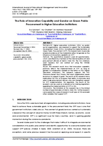Background.Higher education institutions (HEIs), as public sector organizations, are required to support the Sustainable Development Goals(SDGs), including the implementation ofGreen Public Procurement (GPP). This research aims to provide empirical evidence of themoderation effect of gender on theinfluence of innovation capability onGPP. Methods.This quantitative research used 68 questionnaires,which were filled in by members of the internal auditor unit and procurement officials of Islamic state HEIs. The OLS (Ordinary Least Squares) test was carried out using the Minitab application. Results. The research results show that innovation capability positively affectsthe implementation of GPP, as long as gender is amoderation variable on that effectin HEIs (Higher Education Institutions). This research supports the RBV (Resource-BasedView) theory that each organization needs resourcesto support its goals. The results of this research have implications for HEIs to increase their ability to innovate and selectmale procurement officers who can strengthen support for GPP implementation. For regulators, the results of this research can be used as a reference for making regulations regarding the implementation of GPP in HEIs. Conclusions.The limitation of this research lies in the limited number of questionnaires at Islamic state HEIs. Further research can expand the scope of research to all typesof HEIsand add other variables that support GPP.