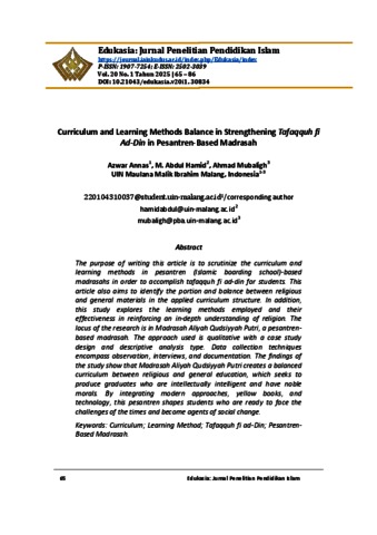 Annas, Azwar, Hamid, M. Abdul and Mubaligh, Ahmad (2025) Curriculum and Learning Methods Balance in Strengthening Tafaqquh fi Ad-Din in Pesantren-Based Madrasah. Edukasia: Jurnal Penelitian Pendidikan Islam, 20 (1). pp. 65-86. ISSN 1907-7254; E-ISSN: 2502-3039