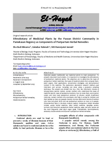 Ethnobotany of medicinal plants by the Pasean District Community in Pamekasan Regency as components of postpartum herbal remedies.