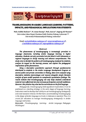 Pedagogically, translanguaging holds significant implications. It can be positioned as a teaching strategy in the early stages of language learning. Instructors need to develop their ability to use translanguaging strategically and avoid excessive reliance. Furthermore, accommodating translanguaging in the design of Arabic language curricula in Indonesia is essential. Thus, it is crucial for educators to manage translanguaging strategically in Arabic language instruction.