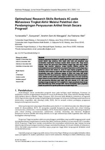 Optimalisasi research skills berbasis 4C pada mahasiswa tingkat akhir melalui pelatihan dan pendampingan penyusunan artikel ilmiah secara progresif.