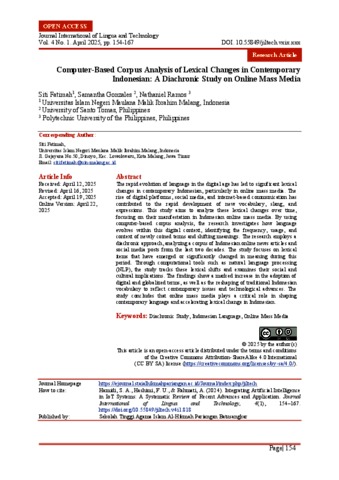 Fatimah, Siti, Gonzales, Samantha and Ramos, Nathaniel (2025) Computer-Based Corpus Analysis of Lexical Changes in Contemporary Indonesian: A Diachronic Study on Online Mass Media. Journal International of Lingua and Technology, 4 (1). pp. 154-167. ISSN 2830-456X