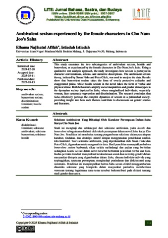 Afifah, Elhama Najihatul and Istiadah, Istiadah (2025) Ambivalent sexism experienced by the female characters in Cho Nam Joo's Saha. LITE: Jurnal Bahasa, Sastra, dan Budaya, 21 (1). pp. 114-124. ISSN 25489488